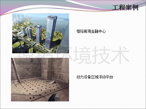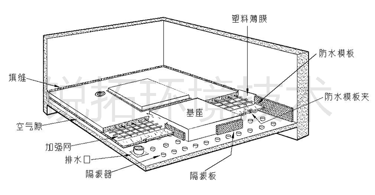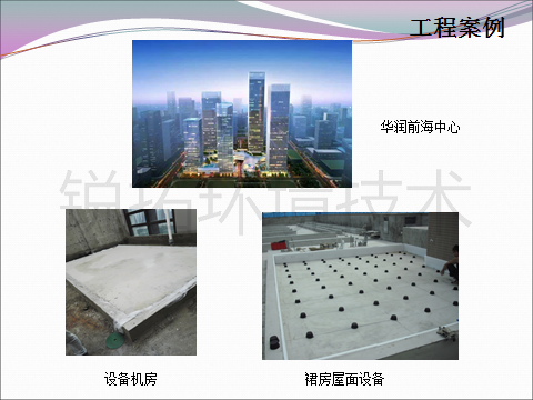 浮筑地板用于设备层的设备振动及噪声阻隔、衰减,其原理就是在设备基础地面层与承重楼板之间配置弹性装置,如弹性材料,即把设备基础地面层浮于楼板上,这时设备基础地面层与弹性装置就构成了一个共振系统。减弱振动设备传经建筑结构的振动是通过消除它们之间的刚性连接实现的,在振动设备与建筑结构之间配置的隔振系统,可有效隔绝振动,从而减少振动经建筑结构的传递。